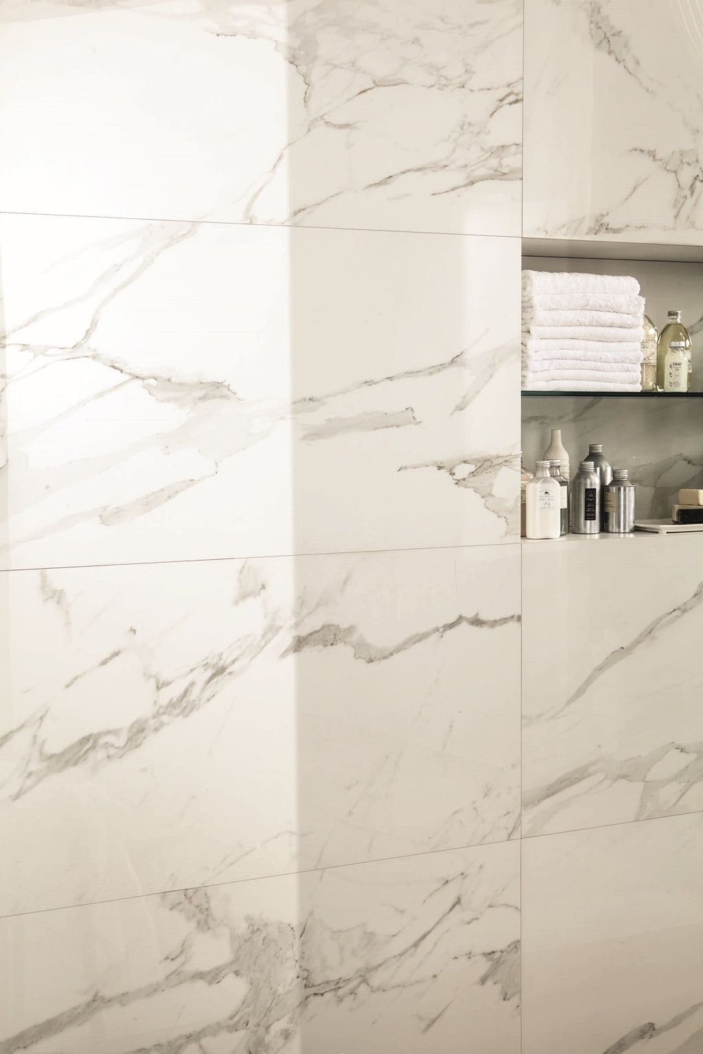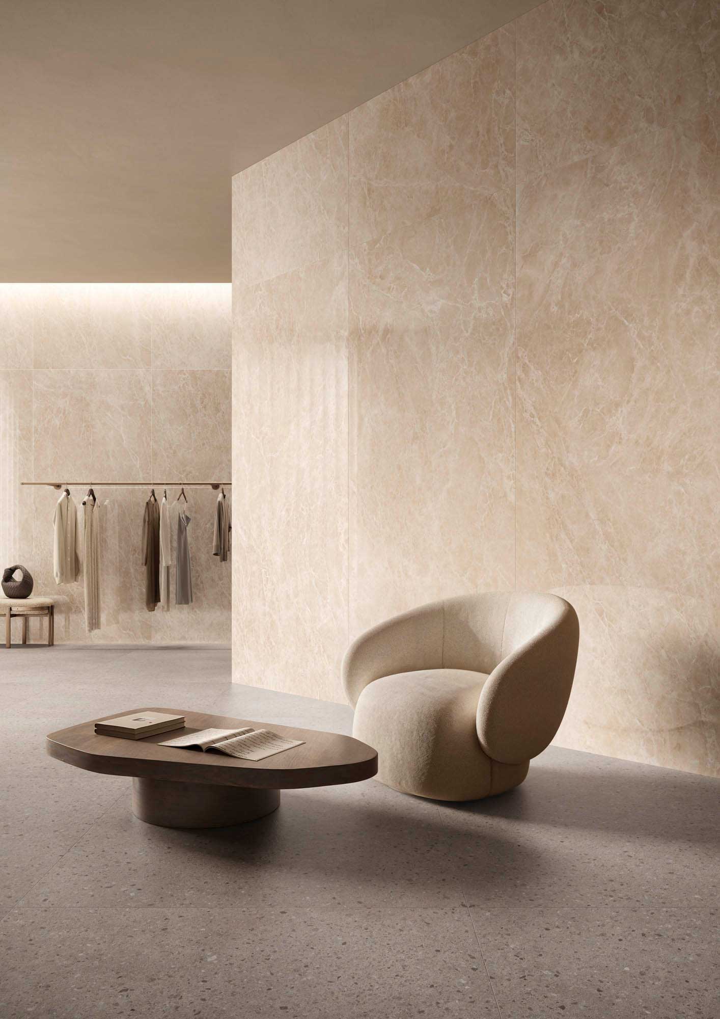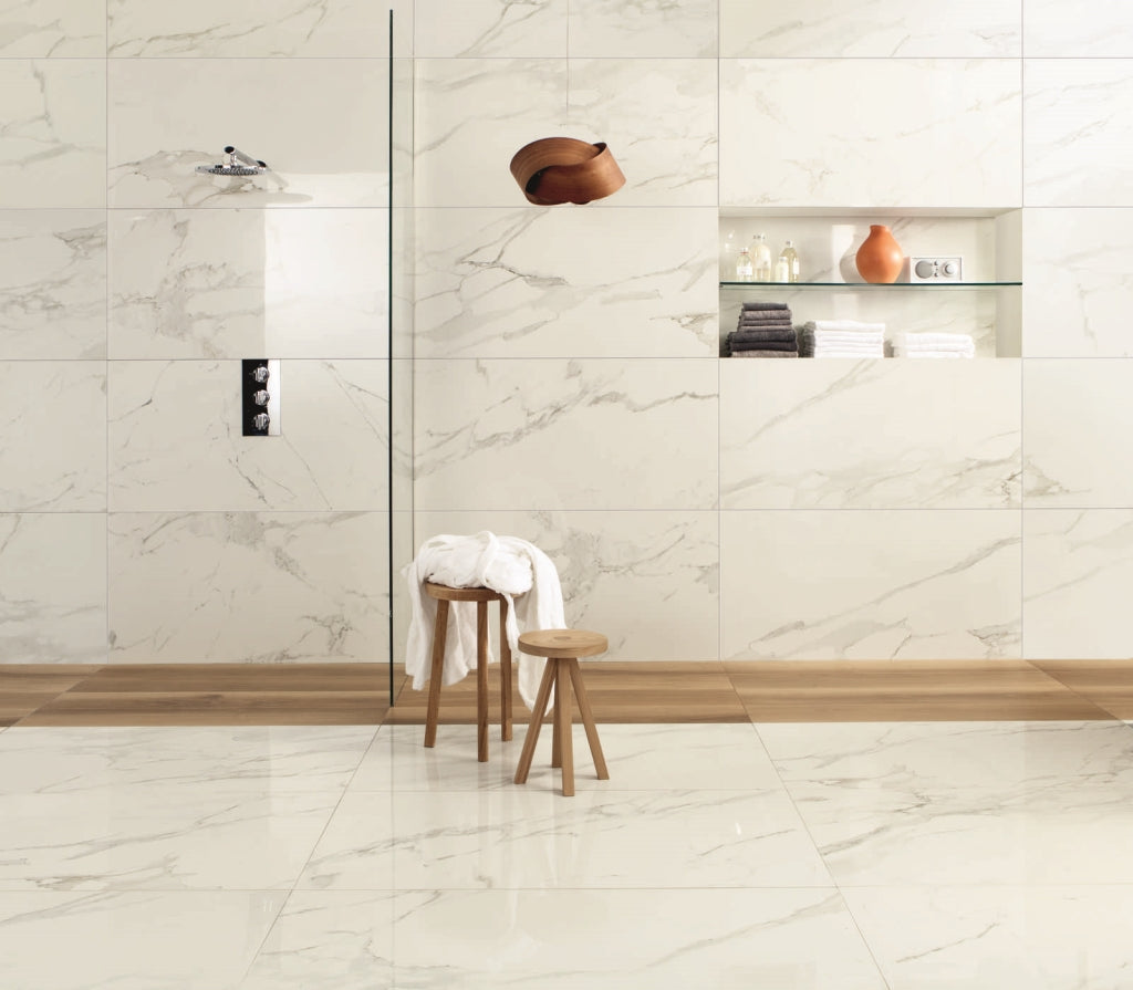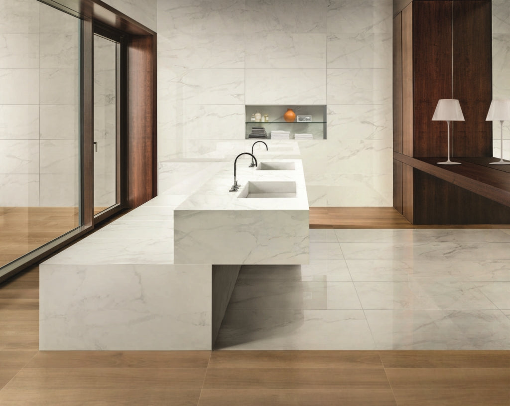 Anima marble-effect porcelain tiles reinterpret the most prized marbles, transforming your spaces with unique, noble, and sought-after style.