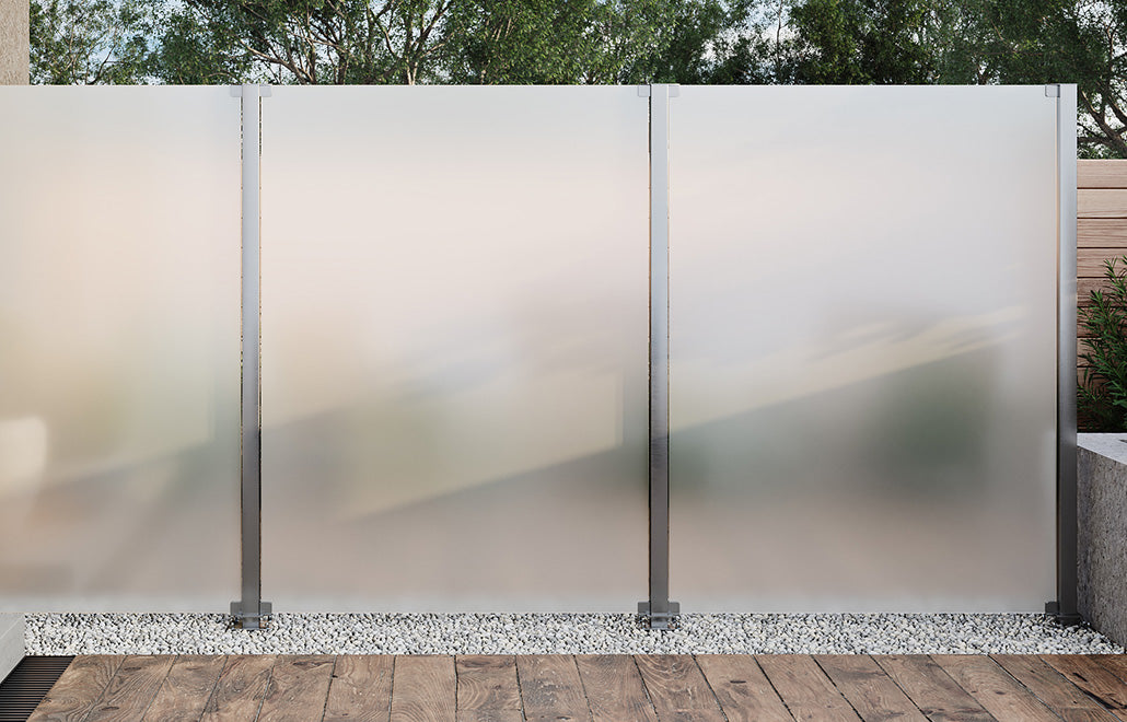 Unlike traditional post systems, Corner has no visible side screws on the glass holders, preserving a clean, minimalist look across the entire fence or screen structure.