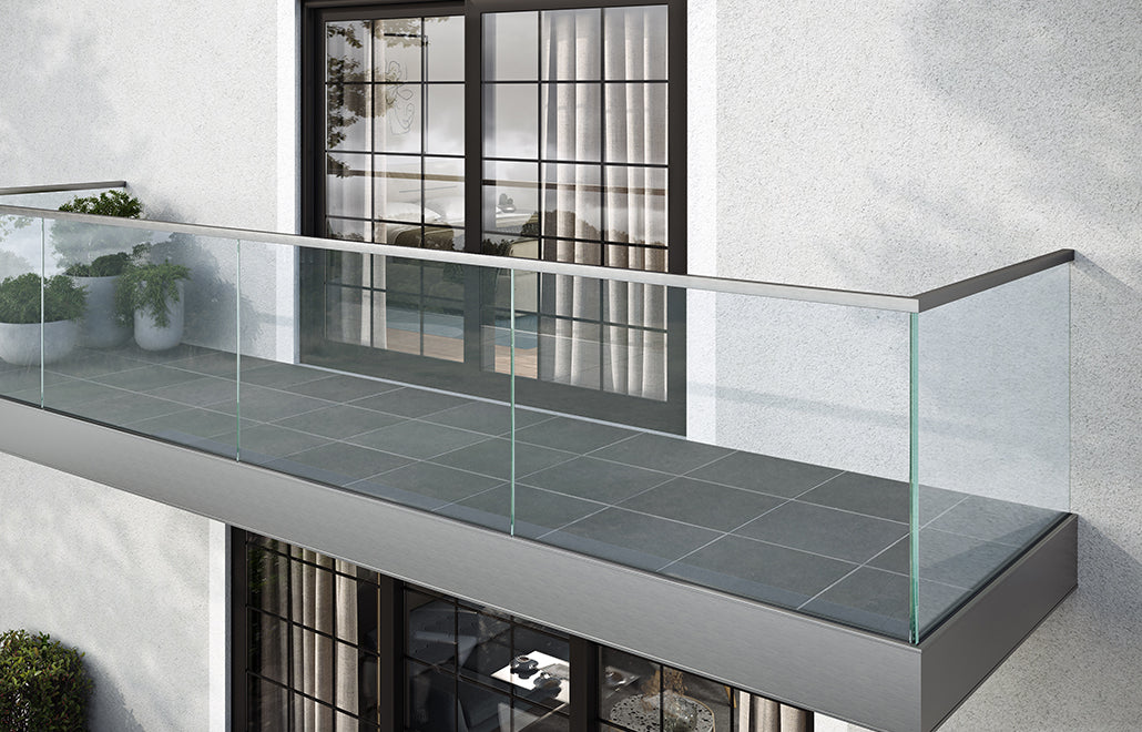 The CUBEAUX railing system consists of a base profile, holding profiles, and a variable cover panel.