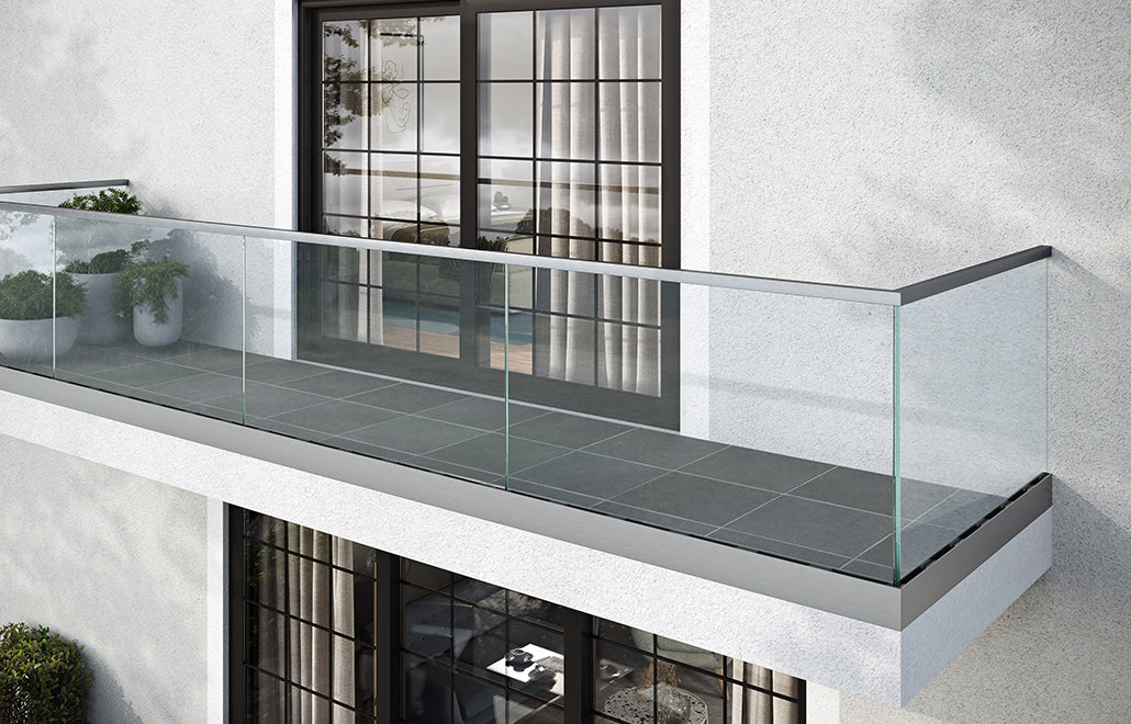 This is made possible by the profile’s internal fastening. Thanks to the closed glass clamping system, flooring can run right up to the profile, producing a clean look with no visible profile.