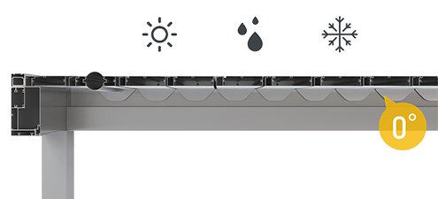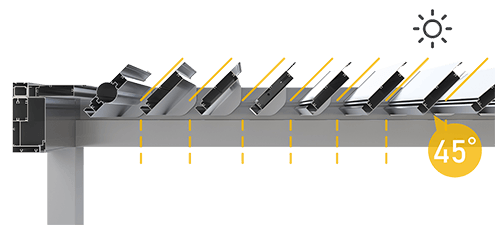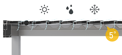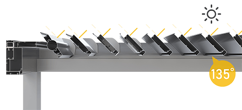 Premium aluminum structure supports dimensions up to 7.5 x 7.5 meters with electrically actuated 135° louvered aluminum lamellae providing complete sun and weather control.