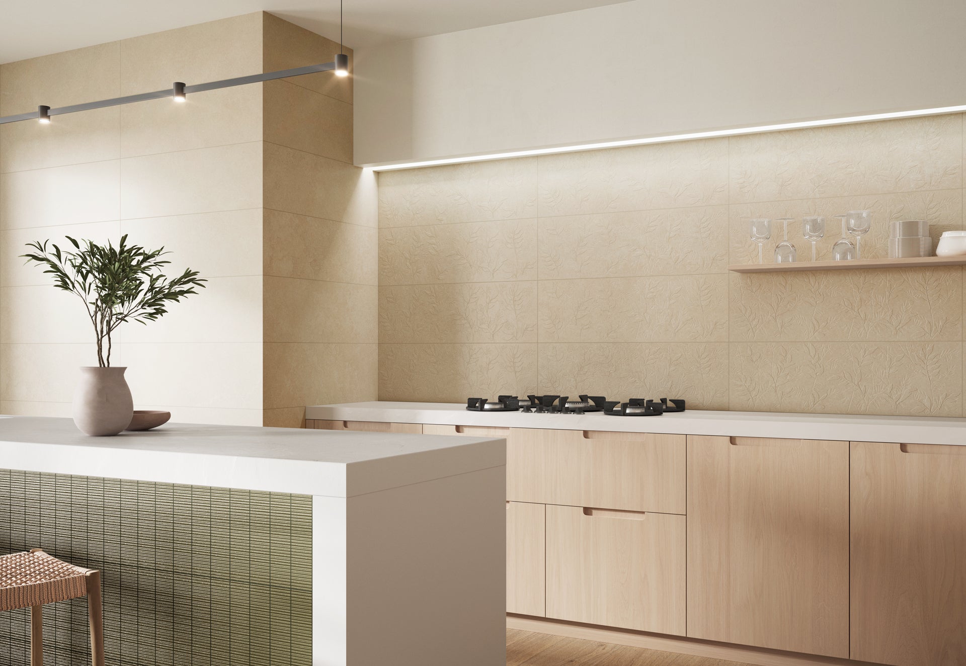 - Kitchen backsplashes or full kitchen wall cladding